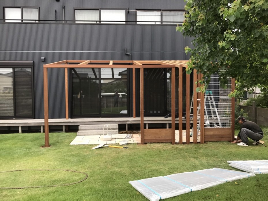 暑い中、長年お世話になっている、ベテランの大工さんにパーゴラを作ってもらっていた時の様子。