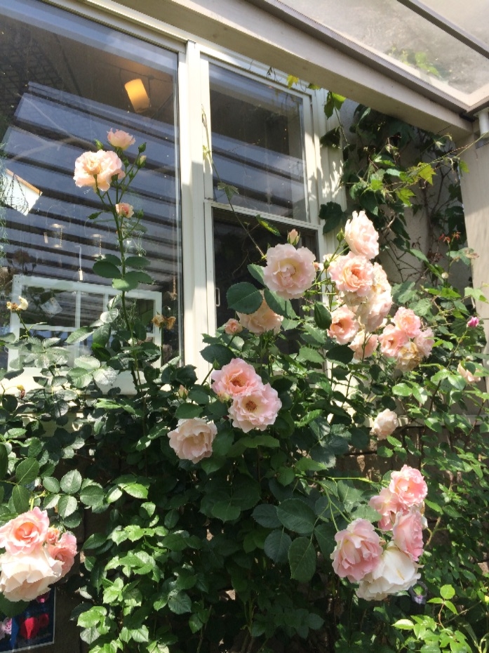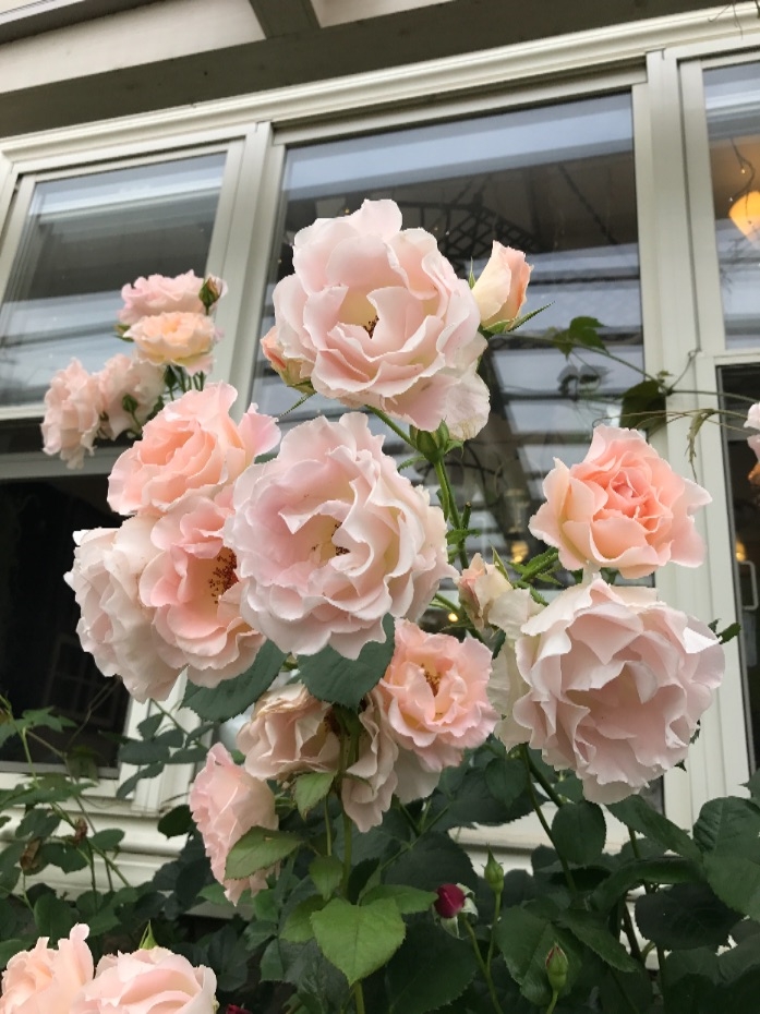 窓際のバラ’ロココ’が満面の笑みで、皆様のお越しをお待ちしております。