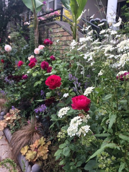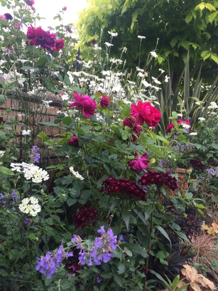 バラ アンダーザローズとキャットミント、ダイアンサス ソーティー、ユーフォルビア ブラックバード、オルレアやアグロステンマの白が花壇全体に明るさを添え、ヒューケラとカレックスのオレンジが足元に動きを出しています。