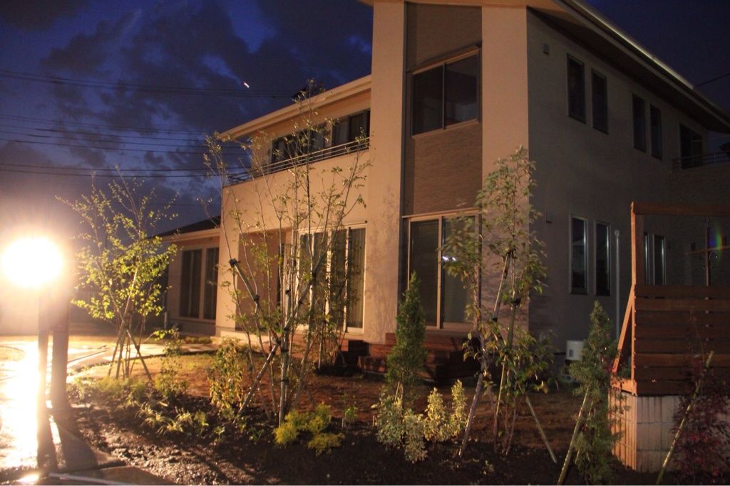 昨年からお打ち合わせを重ね、2月に着工したK様邸。お庭の工事が始まる前は、ピカピカのお家の存在感だけが際立っていましたが、ハード(構造)の工事が完了し緑が入ると、印象が変わってきますよ〜。