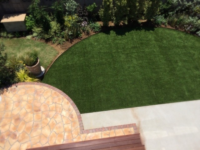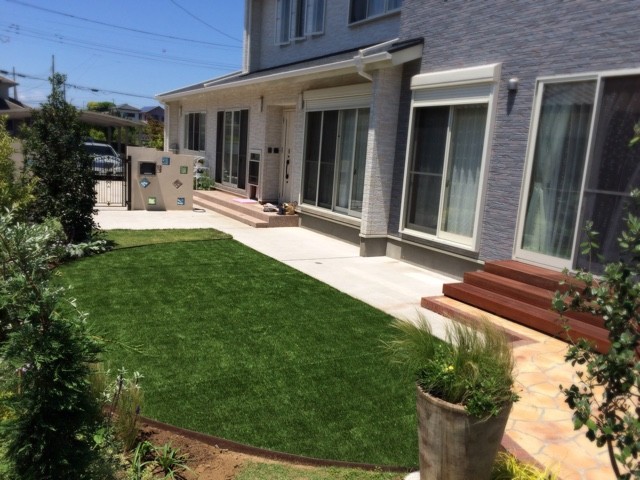 お庭をリニューアルする中で、実は今まで高麗芝だったお庭の一部を人工芝に張り替えました〜。