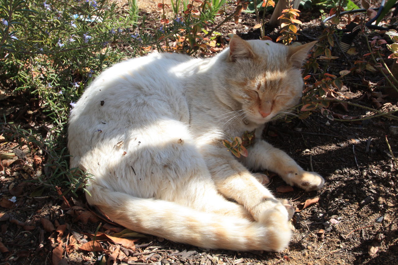 でも、この春の暖かさにお昼寝をがまんする事ができなかったようで、シマトネリコの木陰で朝からずーっとお昼寝をしていました。背中や頭に雑草の種や、ドロンコを付けてきて、いくら毛づくろいをしても、間に合いませんねっ・・・。