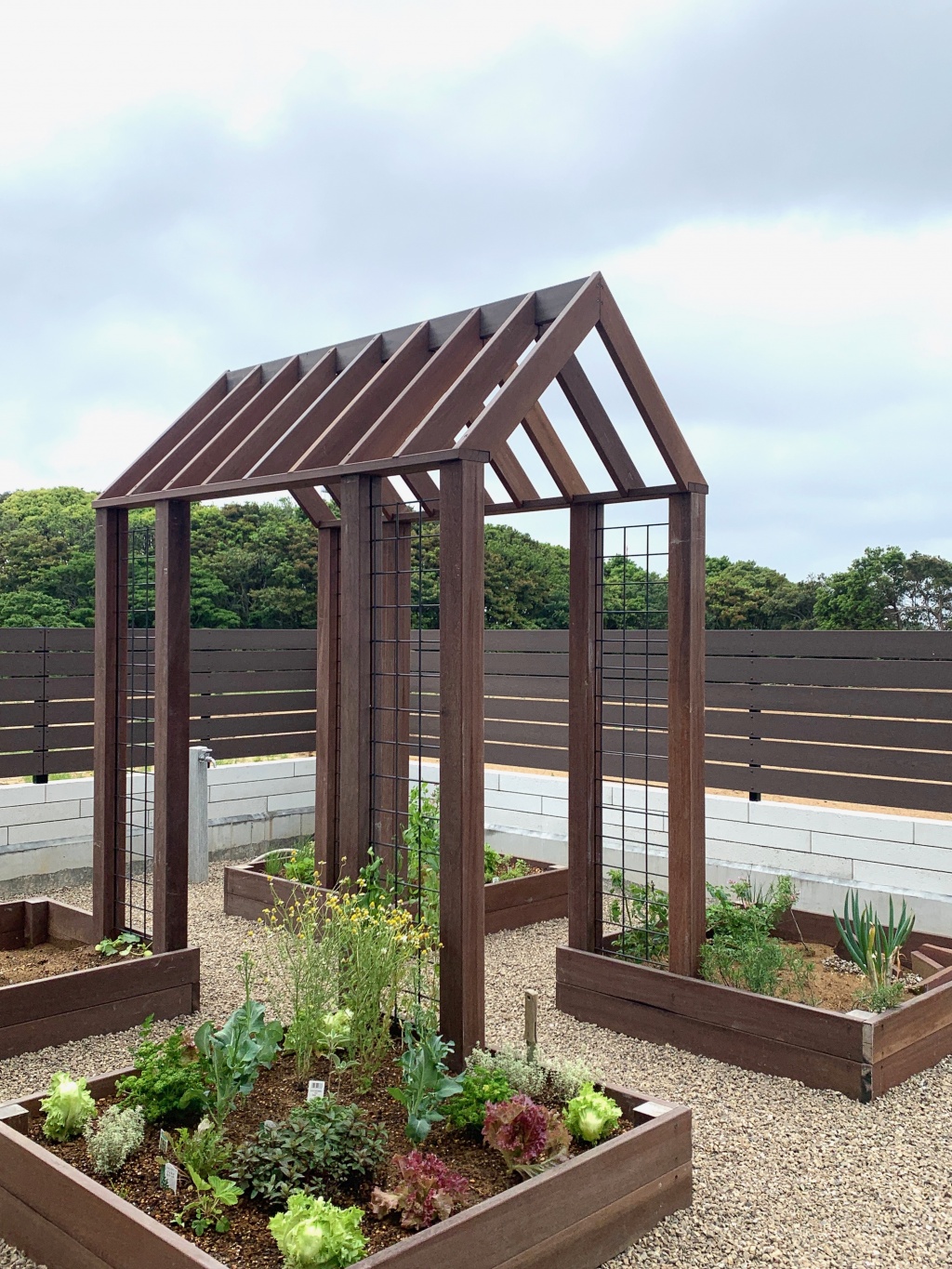 最近、お客様のデザインの中に必ずと言っていいほど取り入れているのが、「キッチンガーデン」です。 しかも、きちんと枠で囲み「畑」にならないようにしているんです。 この「枠(わく)」が大切でこれがあることによって、とってもワクワクするキッチンガーデンになるんですよ!