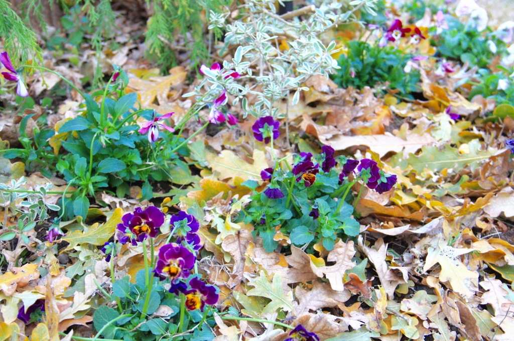 鹿嶋市のエムズ・プランニングでのお庭の冬の楽しみ方のご紹介。パンジーやビオラ、チューリップの球根などを植え込んだあとに、今回は剪定の際に出た枯葉を毛布のように地面に敷き詰めました。、お庭をディスプレイ。土が見えているよりも、暖かな印象でおしゃれです。