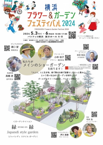 2024年5月3日から6日まで、パシフィコ横浜で開催される、横浜フラワー&ガーデンフェスティバル。 会場のメインガーデンの植栽を、JAGのメンバーとして担当しております! 「緑縁 〜ジャパンディスタイルガーデン」というタイトルで、人と人、人と生き物、緑で繋がる縁で庭暮らしをもっと豊かに」という思いを込めて、ガーデンの制作をいたします。ゴールデンウィークは、パシフィコ横浜でお会いいたしましょう!