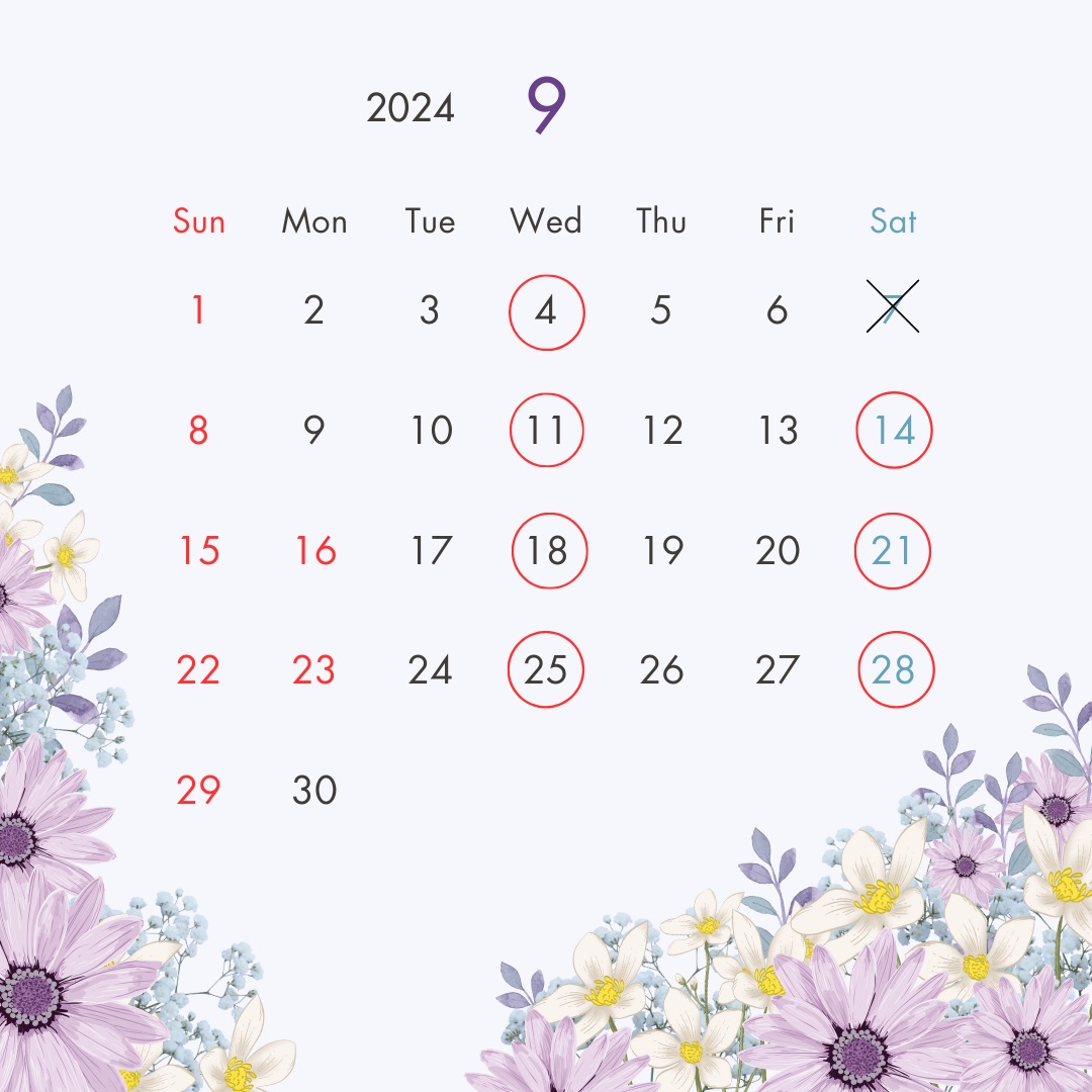 9月になって、朝夕は少しだけ暑さが和らいで来た気がしますね。 今月のショップオープン日のお知らせをいたします。9月11(水)からは秋のお花をたくさんご準備いたしますので、どうぞお楽しみにいらしてくださいませ。