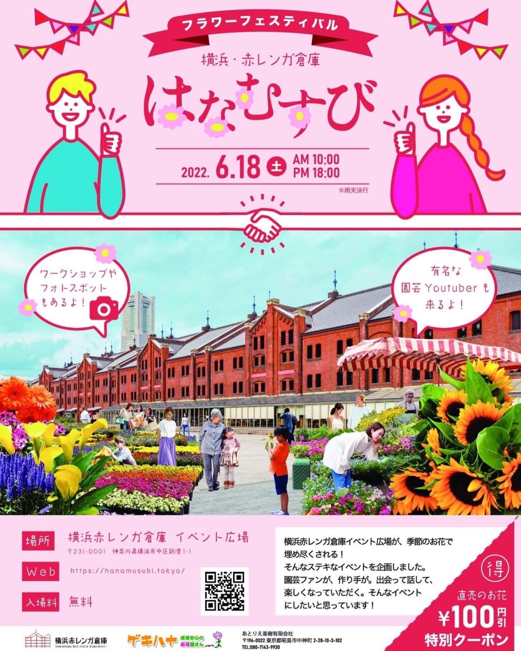 6月18日(土)に横浜赤レンガ倉庫イベント広場にて、「第1回フラワーフェスティバル はなむすび」が開催され、弊社も出展いたします!お花や植物に関わるお仕事をしていらっしゃる方が50社も大集結いたします!時間は、午前10時〜午後18時まで。お花販売や、ワークショップ、キッチンなど、とにかくワクワクが止まらない楽しいひと時になること間違いなし! 是非、6月18(土)に横浜赤れんが倉庫イベント広場でお待ちしております!
