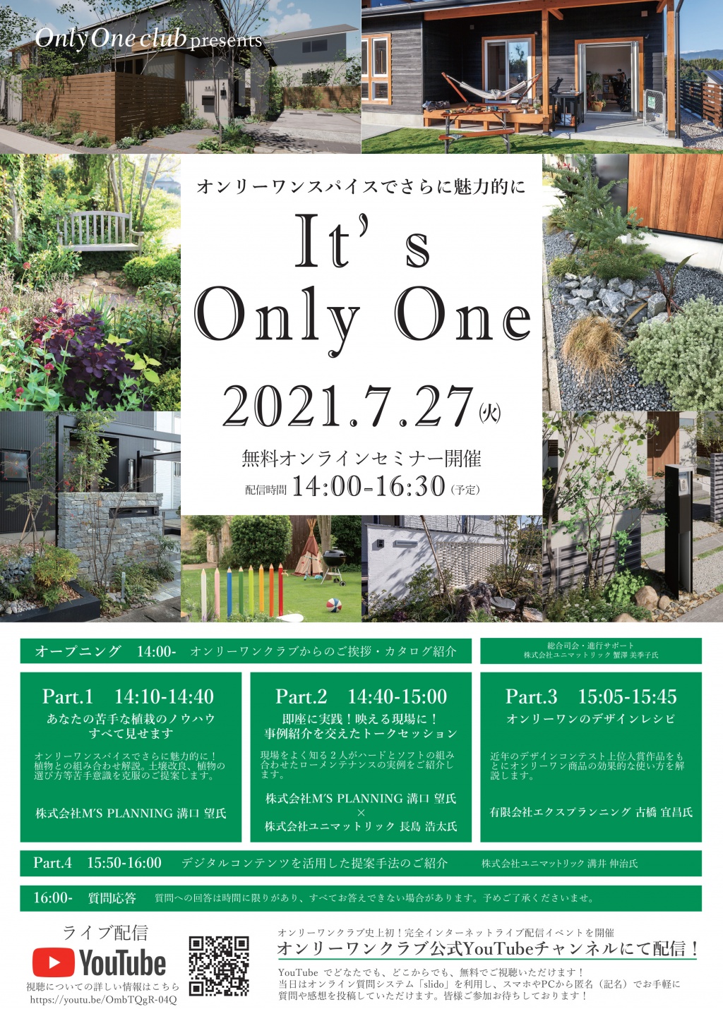 7月27日に、オンリーワンクラブのインターネットライブ配信イベントが開催されます。 私も、ここ8年ほど、外部ブレインとして関わらせていただいており、今回、植栽についてお話をさせていただく機会をいただきました。植栽はちょっと苦手・・・。と思っている方、プロの方に限らず、どなたでもご視聴いただけます。当日は、ご質問や感想なども、投稿していただけますので、皆様ぜひご参加ください!
