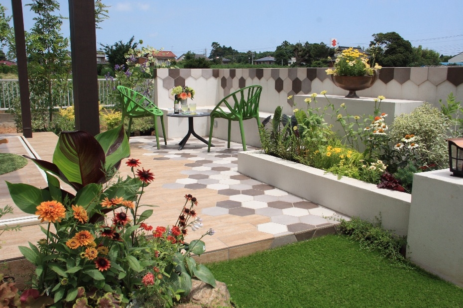 ガーデンルームジーマのある暮らしを撮影に行ってきました。 ギャラリー 本当にまとまった雨が降らないですね〜。このまま、梅雨が雨が開けてしまうのでしょうか?きょうは、香取市のw様のお庭の撮影に行ってきました。昨日から準備を進めさせて頂き、小物やお花を運び入れ、華やかに! ダリア マンゴーとアナベル、ユーパトリウムチョコレートは朝、モデルガーデンのお花を摘み取って持参。蝶々のデザインのマドラーが可愛いでしょ! 夏の日差しに負けない、鮮やかな色のルドベキア。今、一番気に入っている宿根草です。一度お庭に植えこむと、枯らさない限り、一回り大きくなって毎年出て来てくれるのがなんといっても最大の魅力。 ガーデンルームジーマを使い、お庭時間を楽しめる空間を演出しました。ジーマの色の組み合わせにもこだわりましたが、今回は床面に、ヘキサゴンタイルと木目調の2種類のタイルを使い動きが出るようにしています。緑やお花が加わって、ずっとここにいたくなる空間になりました!