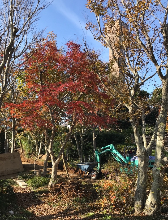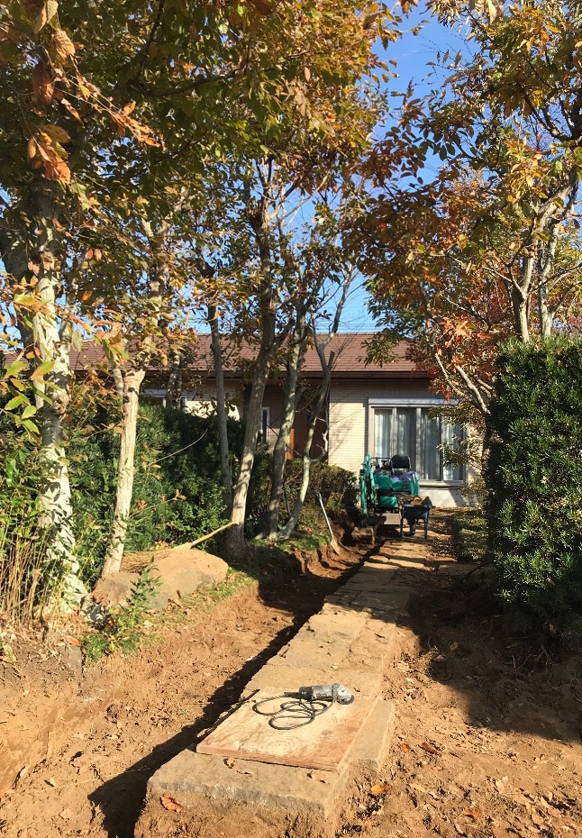 現在作庭中の潮来市のI様邸。既存のステキな雑木に囲まれた石畳のアプローチを生かし、さらに雰囲気のあるエントランスにしていきます。