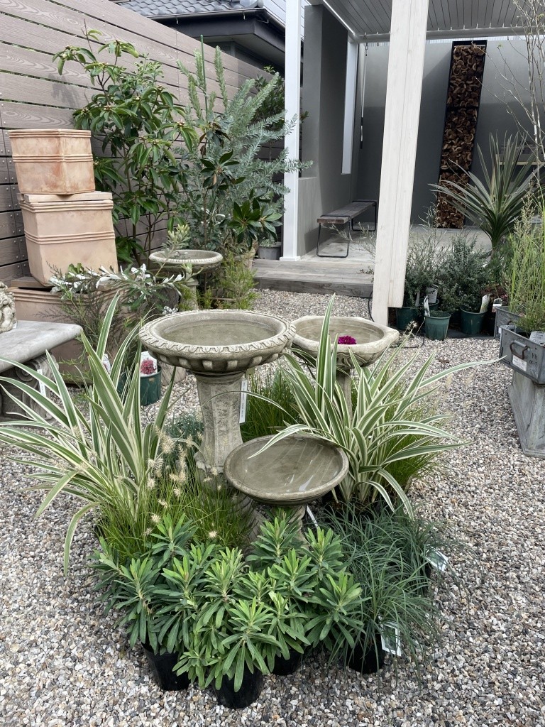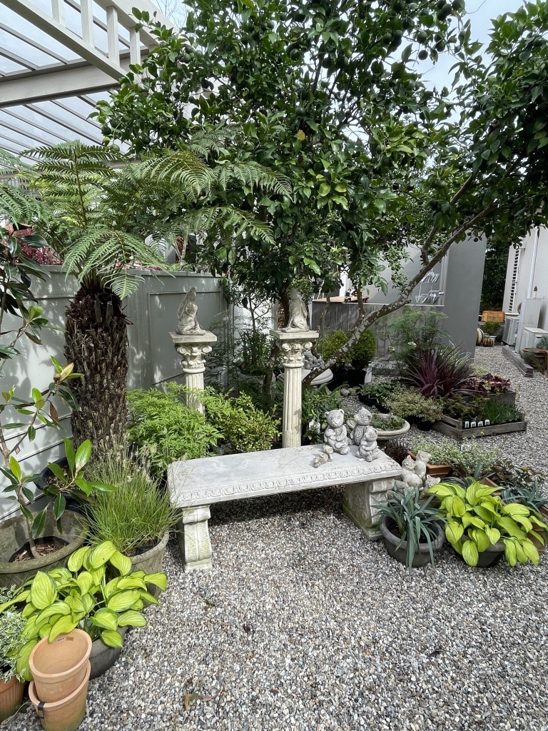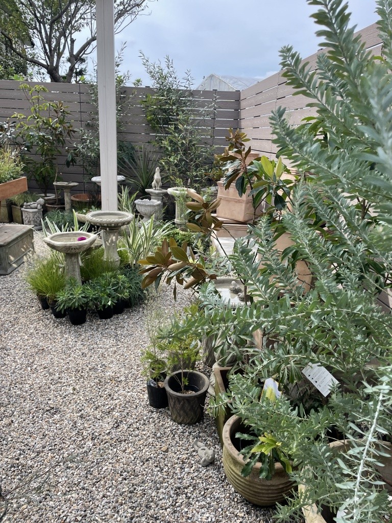 中庭に設置したガーデンファニチャーでゆっくりとお庭を体感していただき、その先にあるゲートをくぐると、季節のお花や、植えっぱなしで楽しめる植物、イギリスからやってきたバードバスやガーデンオブジェ、デンマーク出身のガーデンポットなど、ワクワクがいっぱいのガーデンショップになります!