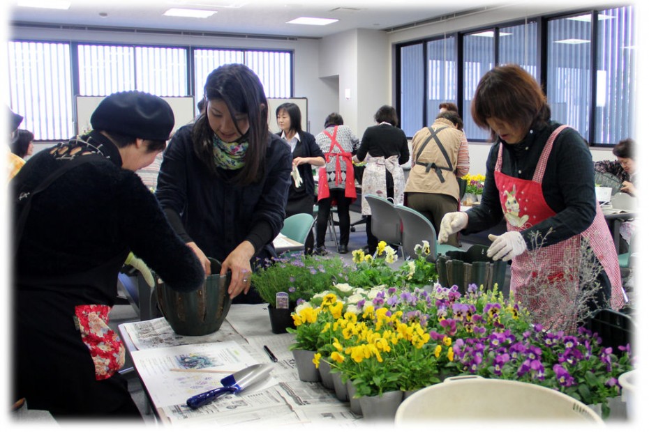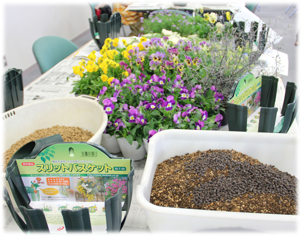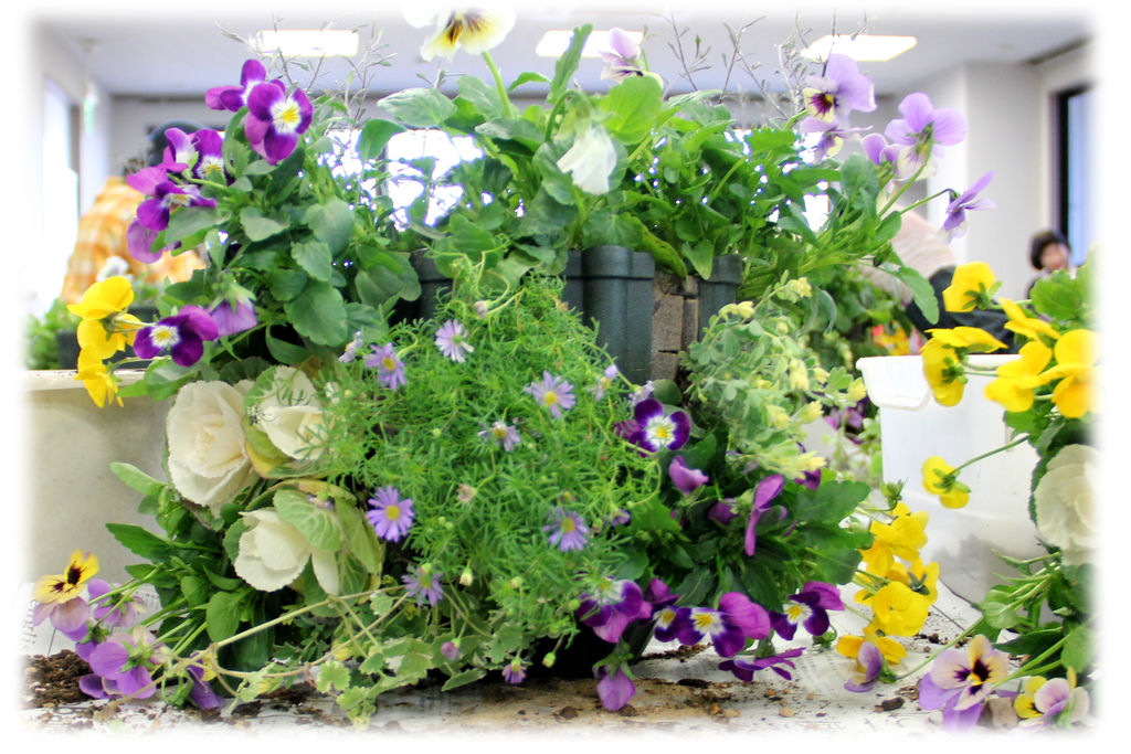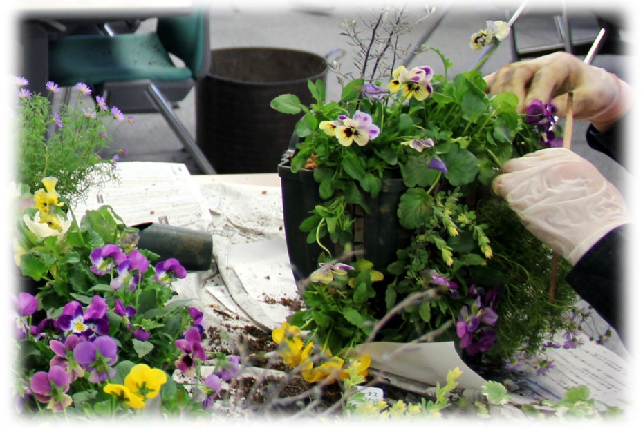 皆さんと一緒に、楽しくハンギングバスケットの寄せ植えを作っているところです。