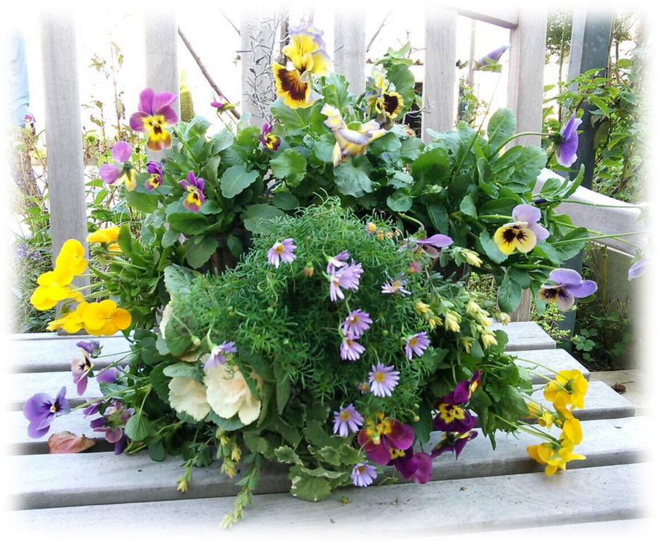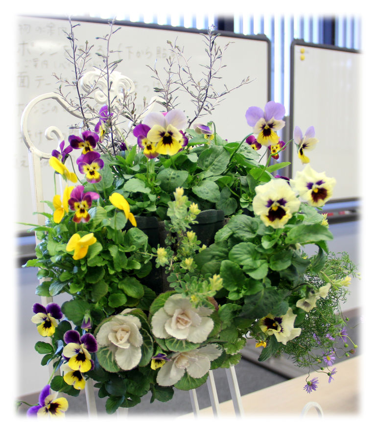 今回は、フリンジ咲きのパンジーやコアラみたいなお顔のビオラ、グレコマ、葉ボタン、ブラキカム、コロキアなどを使っています。お色は、クリーム色から濃い黄色、そして、補色の紫色へと色を繋いだ、壁掛け用ハンギングです。
