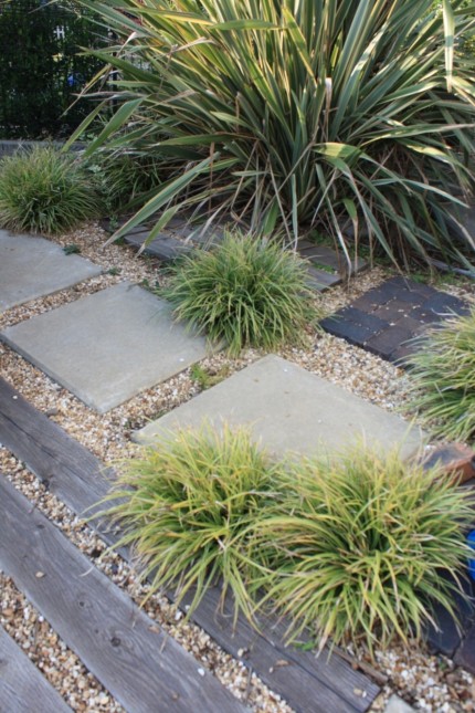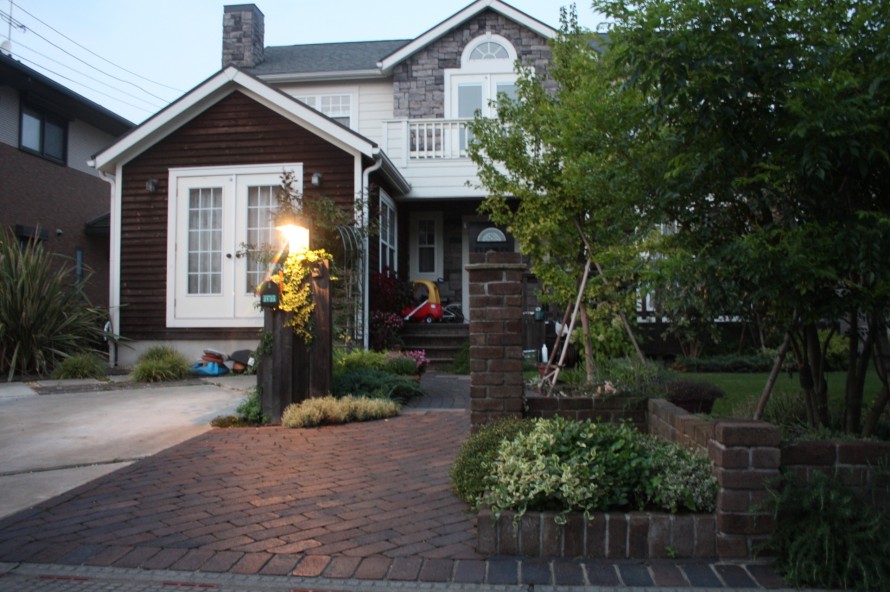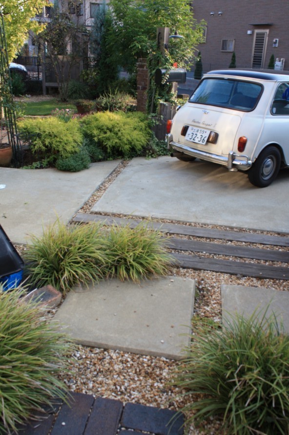 枕木の間から直線的なグラスが揺れるカースペース。 エントランス&カースペース コンクリートの白い色と、枕木の焦げ茶色、そしてイギリスから輸入した砂利と直線的なグラスを入れ込んで、モダンアートのような絵画的なカースペースを作りました。 カースペースが絵になると、車がない時にもお庭の一部としての役割を果たしてくれます。 カースペースから続くレンガのアプローチと門周り。