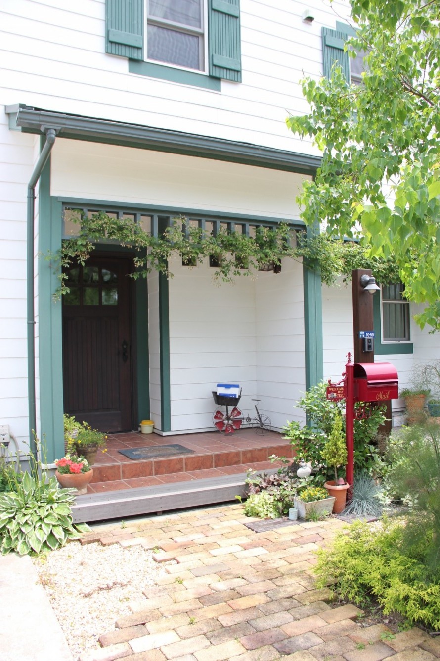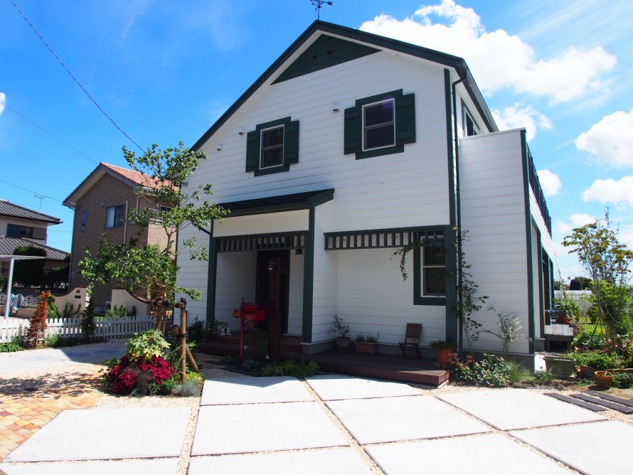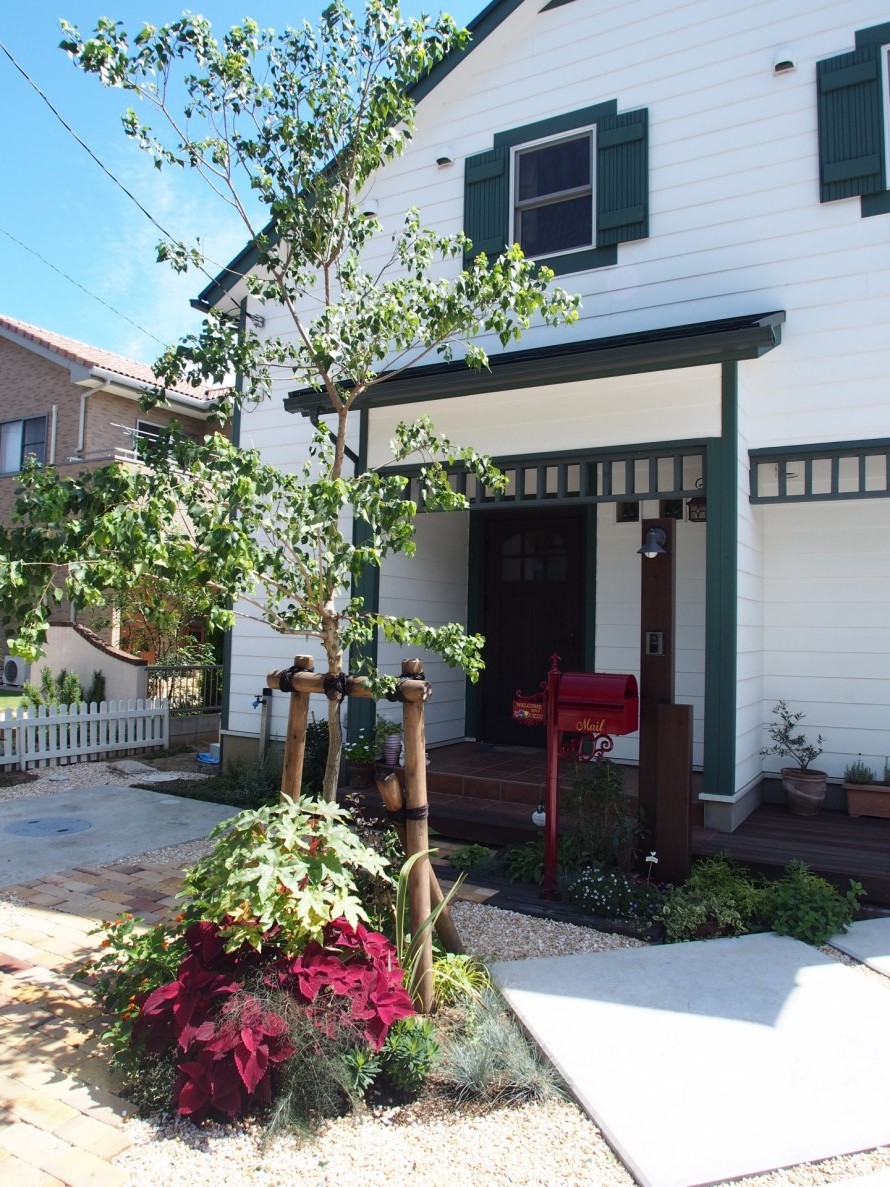| ポイント | ご新築に合わせ、エクステリアとお庭をデザインしました。アーリーアメリカン調の建物に合わせ、かわいらしくもあり、懐かしくもあり、ちょっとベンチで一息ついてみたくなるようなエントランススペースにデザインしました。 |