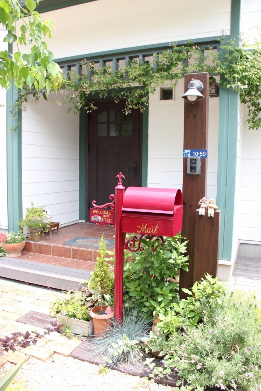 赤いポストがとってもキュートなエントランス。表札はトールペインティングをされている奥様の手作り仕上げです。