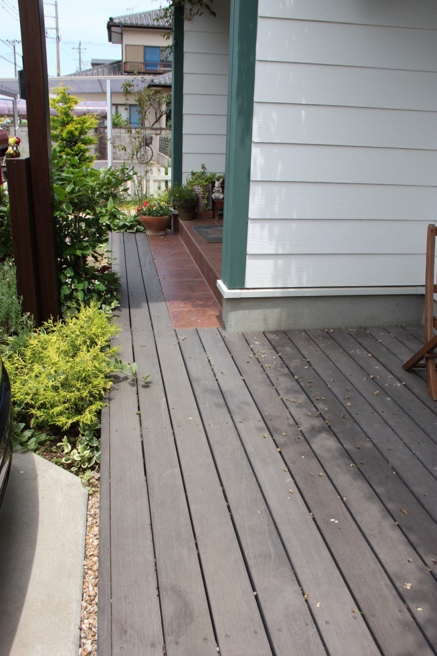 玄関前のポーチ階段をアイアンウッドで延長し、今まで、有効活用ができなかったスペースにウェルカムベンチが置けるコーナーを作りました。
