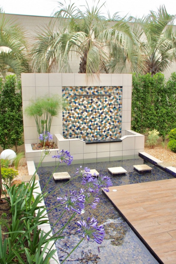 水面ギリギリに飛び石風のステップを作りました。こちらをり、タイルデッキに辿りつくデザインになっています。ちょっとスリリングでしょ!