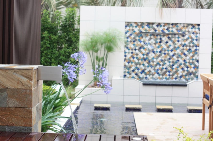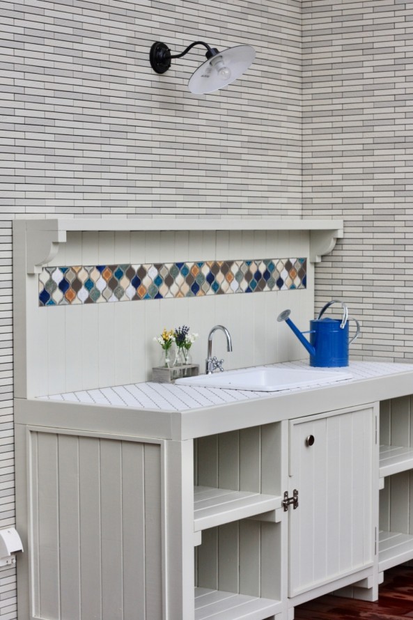 壁泉と同じタイルをあしらった、オリジナルデザインのアウトドアキッチン。