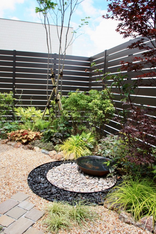 水盤とスチールの丸い枠をオーダーで特注しました。 円で広がるように配置し、異なる砂利で変化をつけています。