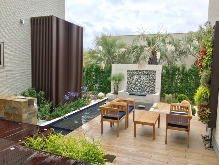 千葉県旭市にある、郡建設株式会社様のモデルハウスのお庭を創らせていただきました。テーマは「ホームリゾートガーデン」。ヤシの木が風に揺れ、お友達や家族が集い、幸せなひと時を過ごせるお庭にデザインしました。