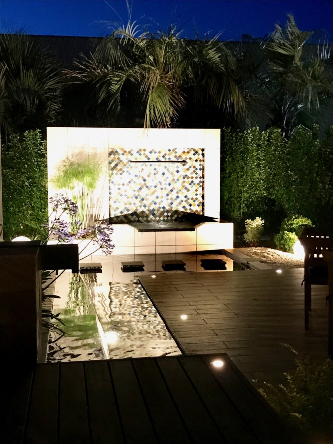 ナイトシーンも華やかです。ガビオンの足元には、バー状になっているLEDのライトを取り付けてあるので、石の模様がとても綺麗に見えます。