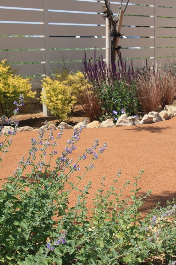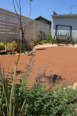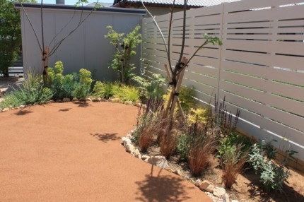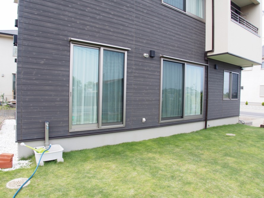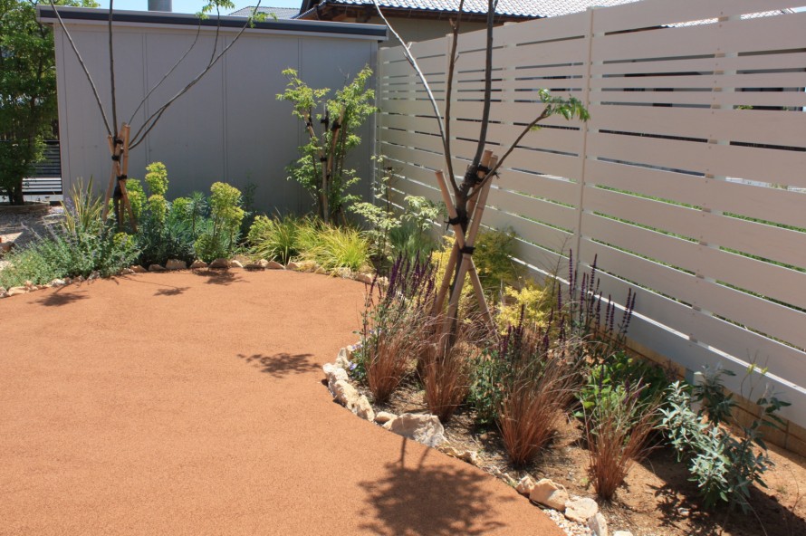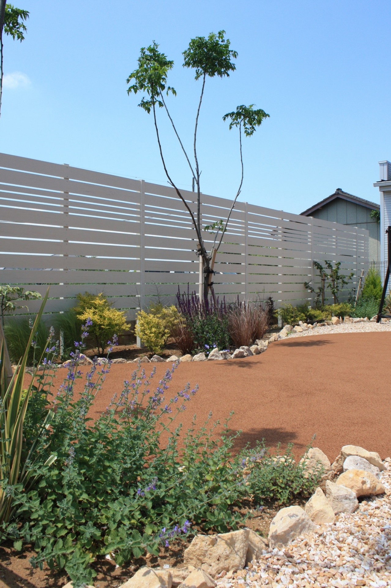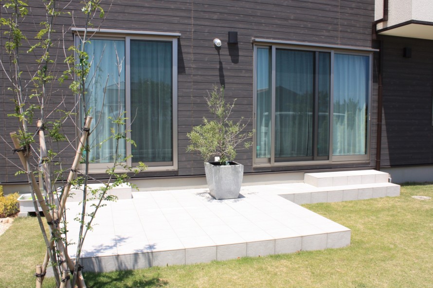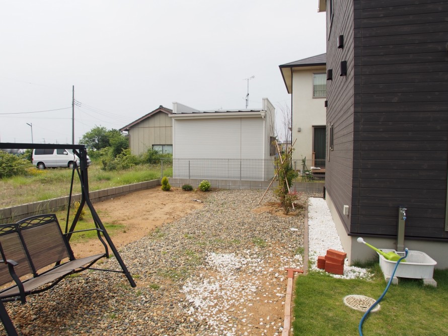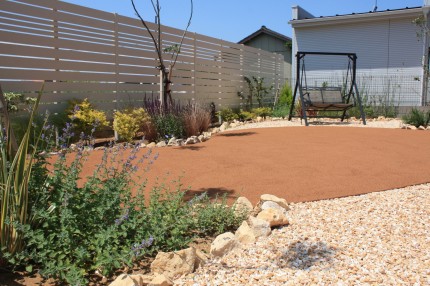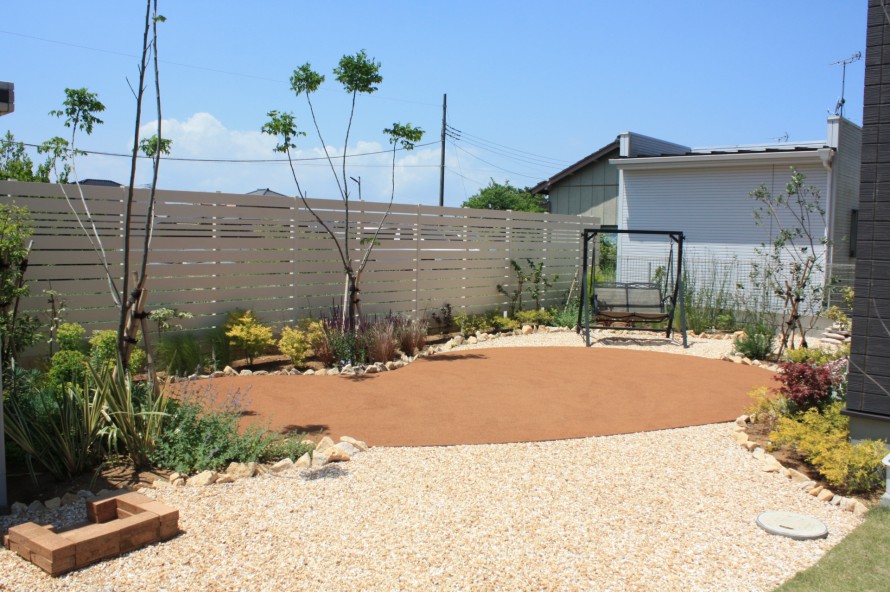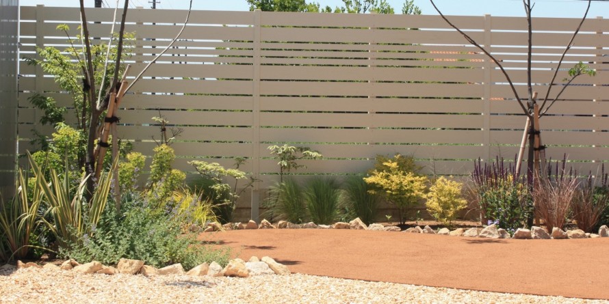 白いフェンスで作るプライベート空間。 お庭のリノベーションフェンス・物置・オブジェ 茨城県 神栖市 T様邸 竣工 2014年 ポイント リビング前にタイルデッキを作り、お庭にとの繋がりを持たせ、気軽にお庭に出られるようになりました。また、プライベートなお庭で夏はお子様と一緒にプールを楽しめるよう、高さのあるフェンスで囲い道路からの視線が通らないようにしています。 お隣さんとの境界線に高さ2mの白い樹脂フェンスを作り、プライベート空間が満喫できるようにしました。もちろん、樹脂製なので、防腐処理のために年に一度塗装が必要…。なんてことはありません!メンテナンスがとっても楽な目隠しフェンスです。 フェンスの足元には、海が近いT様邸でも潮風に負けずに育つセンダンの木をシンボルツリーとして2本植えています。西側にセンダンの木を植えることで、木が大きくなると、立派な木陰ができるようになります。 木の足元には、風を感じるグラス類や宿根草、メンテナンスが楽で、毎年楽しめる『キャットミント』や『サルビアネモローサ ’カラドンナ’などを植え込んでいます。 茶色く見える部分は、まだ、小さなお子様が転んでも怪我が最小限で済むように、柔らかな素材でできています。この素材は、公共工事によく使われるのですが、ご自宅の一部にこんな公園のようなスペースがあるなんて、とっても贅沢ですよね!このエリアは、夏のプールを楽しむ空間として今回お作りしました。 砂利敷きの部分にはもちろん、防草シートが敷いてあるので、今までのお悩みだった、雑草の出かたが全然違います! 植栽スペースの見切りには、ベージュ色の自然石を並べ、アクセントにしています。春の訪れを告げてくれる、私の大好きな植物、『ユーフォルビア ’ウルフェニー’』が見事です! お隣さんとの境界線には、ブロック積みがしてあるだけでした。ここを、プライベート空間にリノベーションしていきます! メンテナンスを楽にしながら、ゆっくりと家族みんなでくつろげるプライベートなお庭に変身しました!夏には、プール専用スペースになります! 今回の工事で、もう一つのお悩みであったリビング前の段差をタイルデッキを作ることで、解消しました。 ご主人がお手入れされている芝生エリアからどこからでも上がれるように高さを設計したタイルデッキ。リビング前に、お家に出入りしやすいように階段を1段設けています。