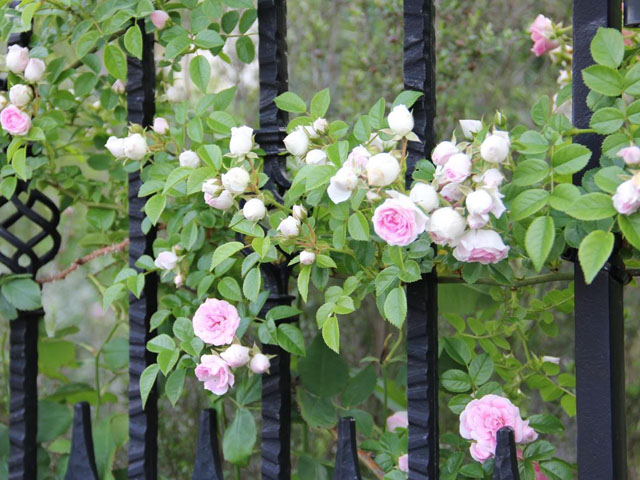 ピンクのプチローズが映えるロートアルミのフェンス。