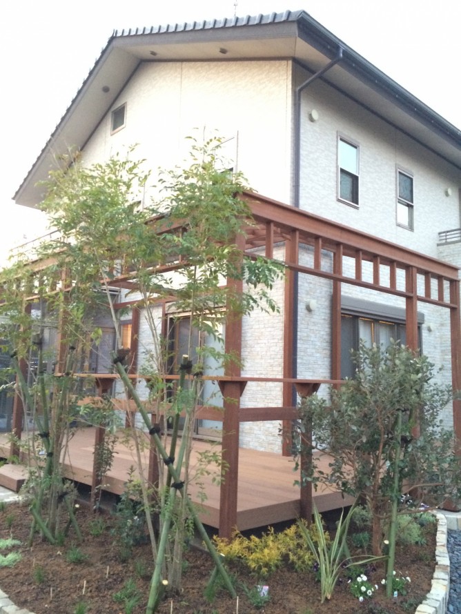 アイアンウッドで創る、飾り格子のあるパーゴラ。 デッキ・テラス・パーゴラ 建物サッシからL型に出来上がっていたデッキ。西日が強く、午後の時間帯はなかなかここで過ごすことが難しかったことがお悩みでした。このデッキをさらに使いやすくするため、アイアンウッドでデザイン格子付きのパーゴラをデザインしました。