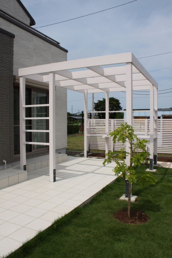 白いタイルでテラスをつくり、そのタイルテラスに快適に過ごせるスペースとして作ったのが、日よけのための白いパーゴラ。ちょっとしたものをデイスプレイできる棚も作りつけています。
